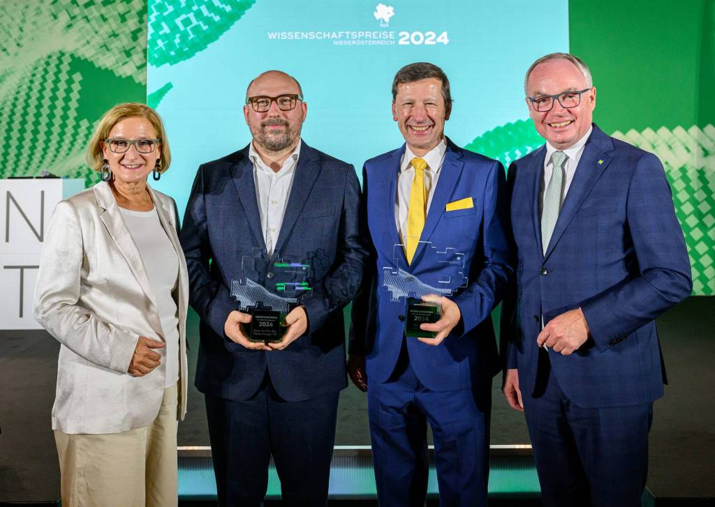 Die Würdigungspreisträger des Wissenschaftspreises 2024, Thomas Eiwegger (2. v. l.) und Ludwig Huber (2. v. r. ) mit Landeshauptfrau Johanna Mikl-Leitner und LH-Stellvertreter Stephan Pernkopf. © NLK Burchhart