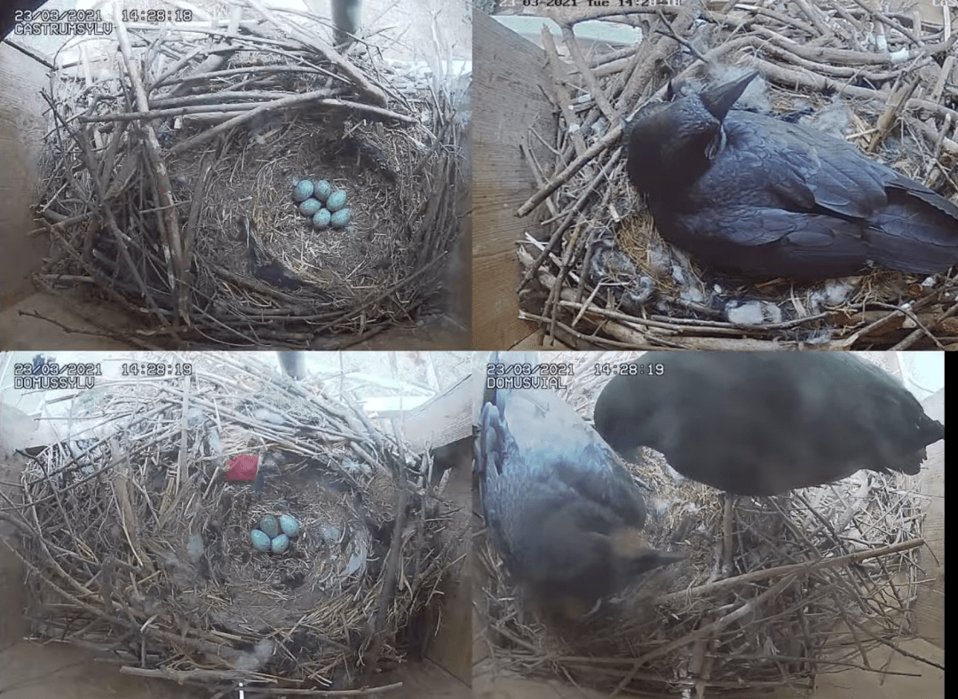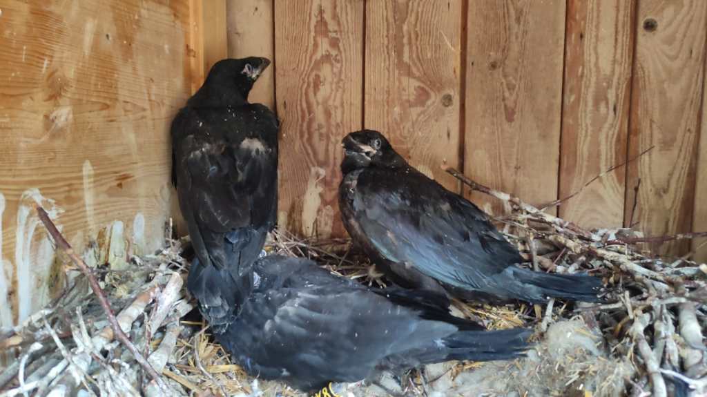 Der erste Nachwuchs ist bereits da – teilweise sitzen unsere Raben auf ihrem Gelege, aber mit Hilfe der 24-Stunden Brutnischenkameras können wir bereits den einen oder anderen Jungvogel beobachten. Die Eiablage (irgendwo zwischen 2-7 Eiern) erfolgt meist Mitte Februar, die Brutzeit dauert rund 20 Tage, die Nestlingzeit der jungen Raben die vollkommen blind und nackt geboren werden beträgt rund 40 Tage. Alles in allem verlassen die jungen Raben zwischen Mitte April und Mitte Mai ihr Nest zum ersten Ausflug.